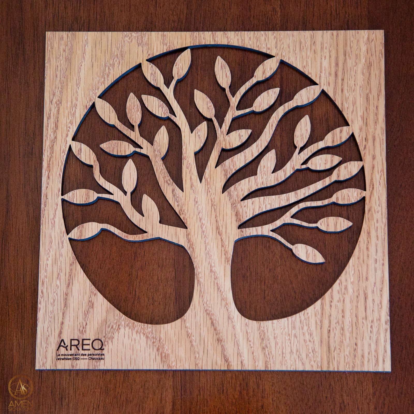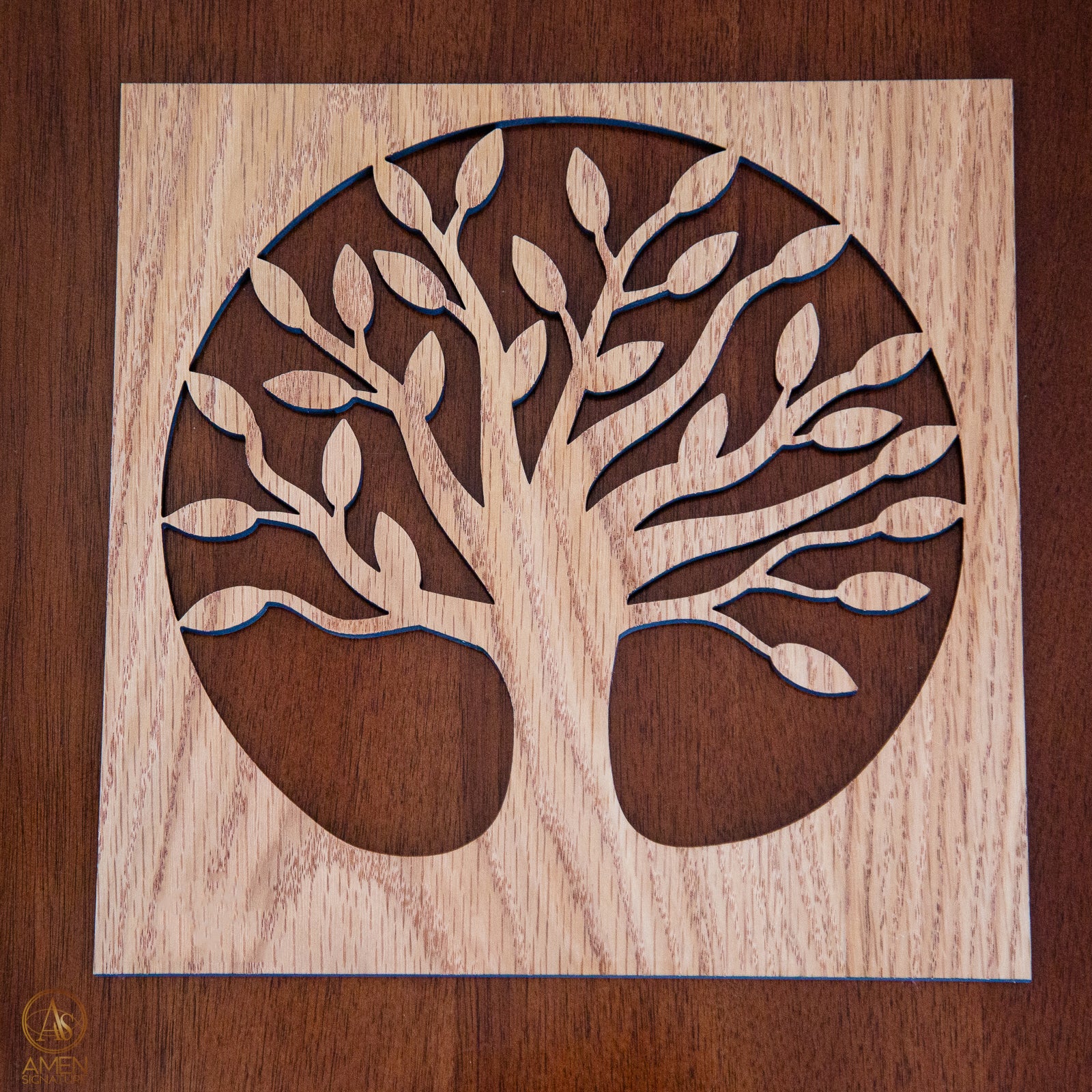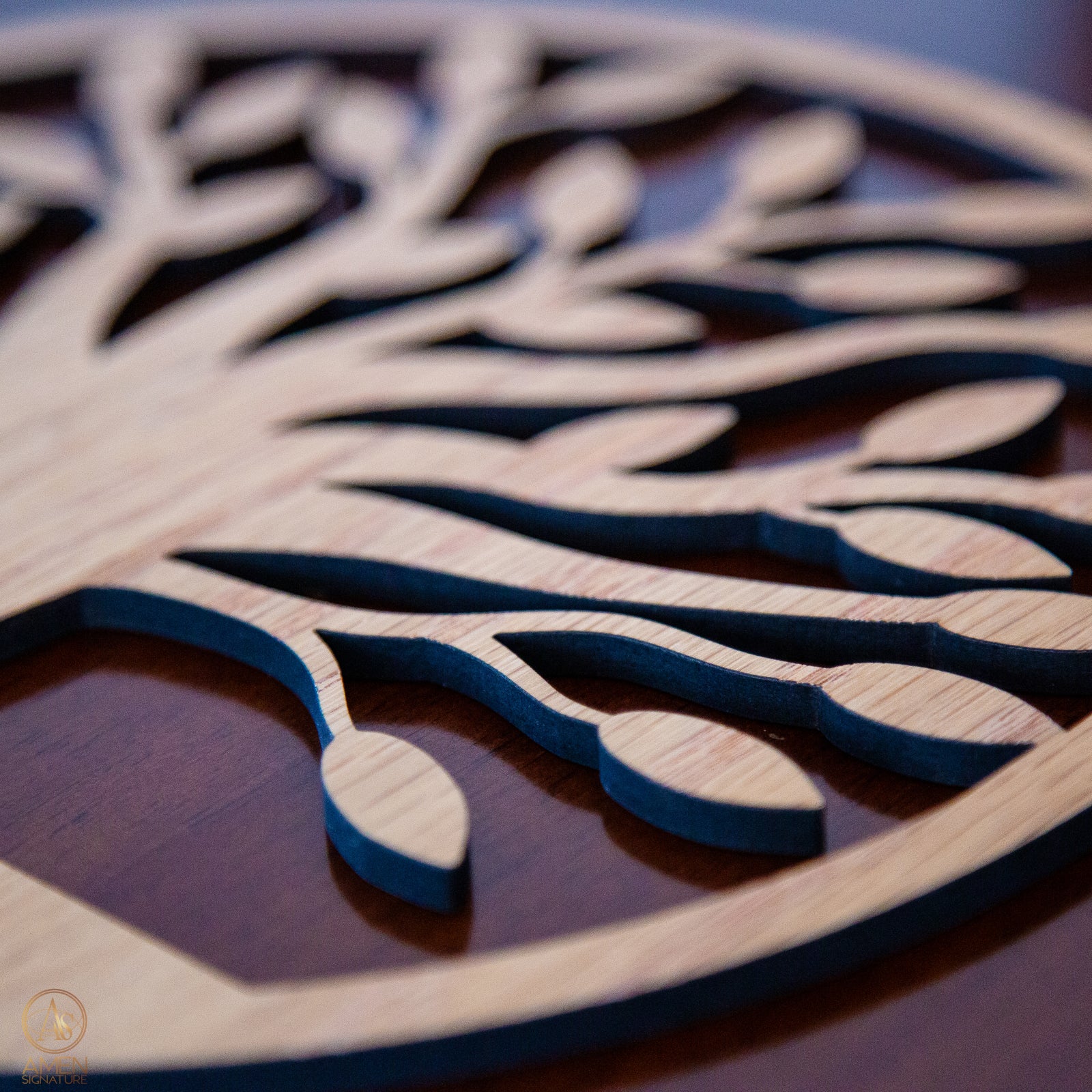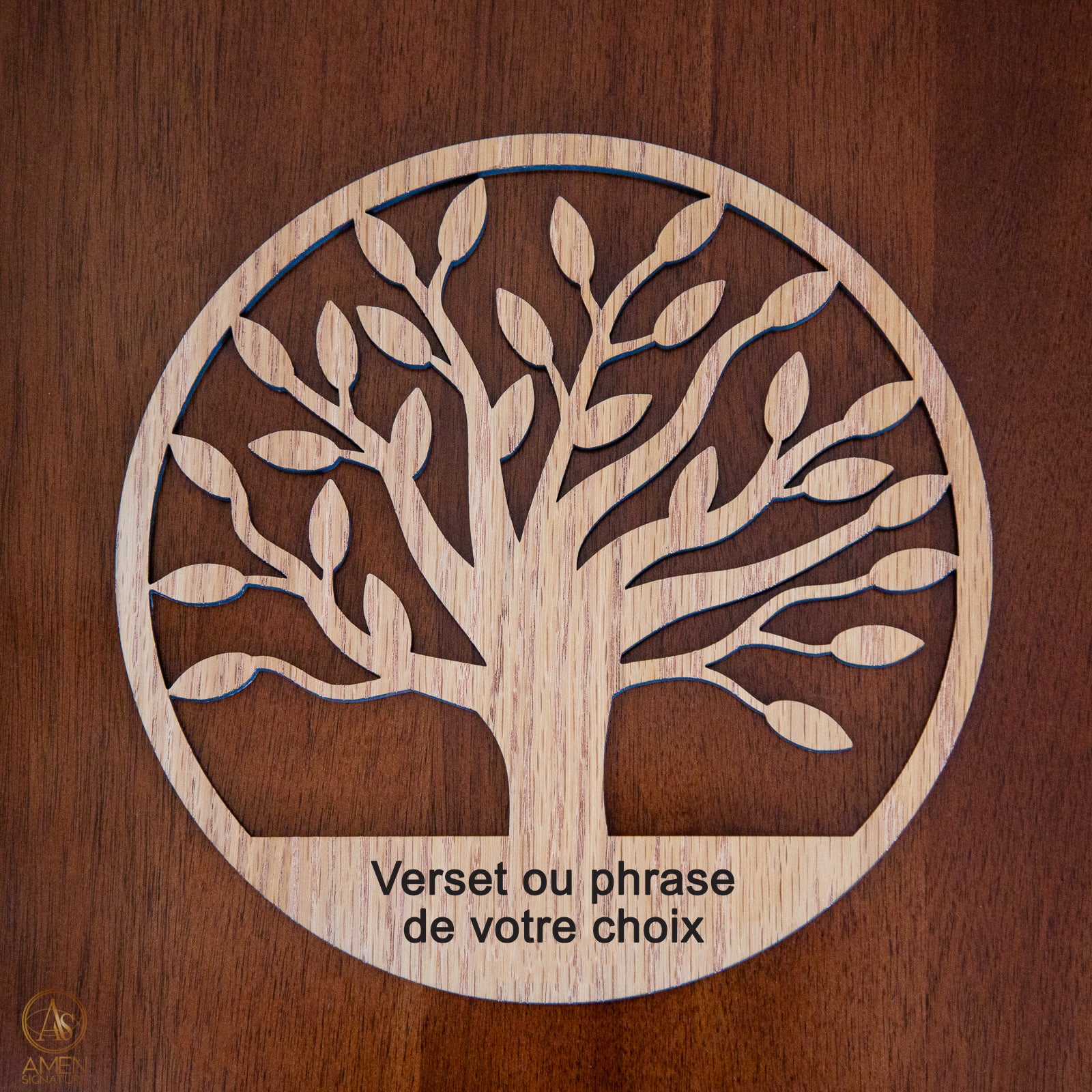 L’arbre de vie prend forme ici avec ce panneau mural en chêne verni, découpé avec précision. Un symbole intemporel de croissance, de force et de bénédiction.
