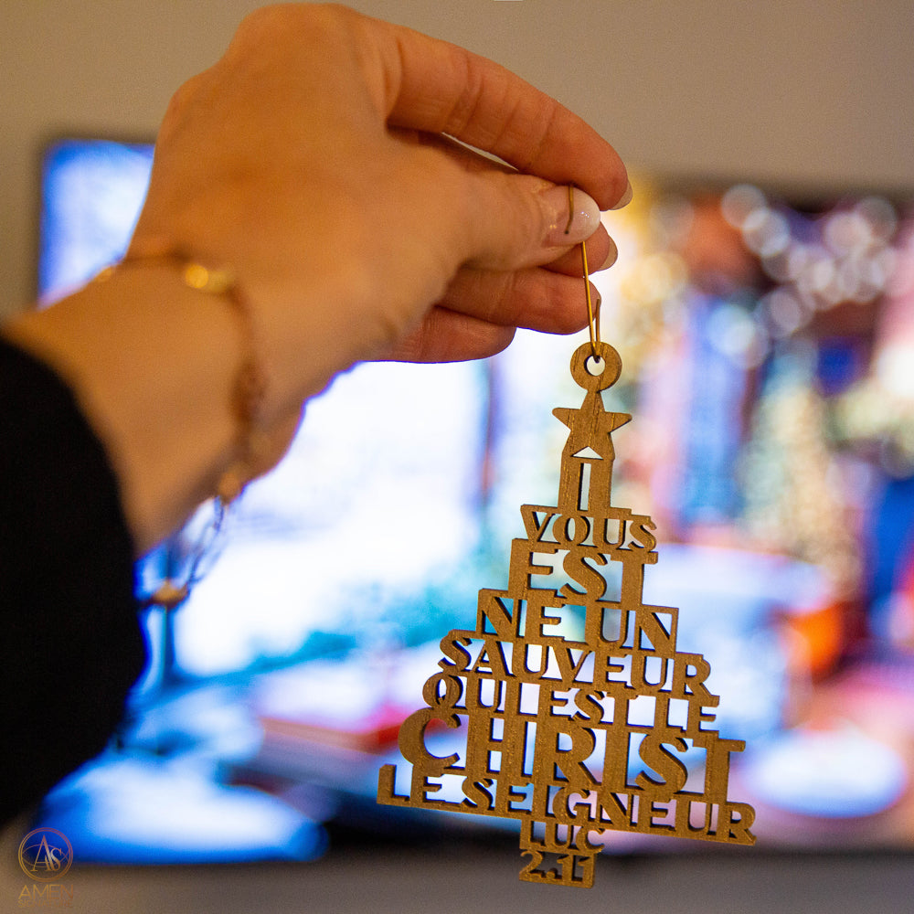 Cette boule de Noël en bois doré, découpée en forme de sapin, porte un message intemporel Il vous est né un Sauveur qui est le Christ, le Seigneur. - Luc 2,11