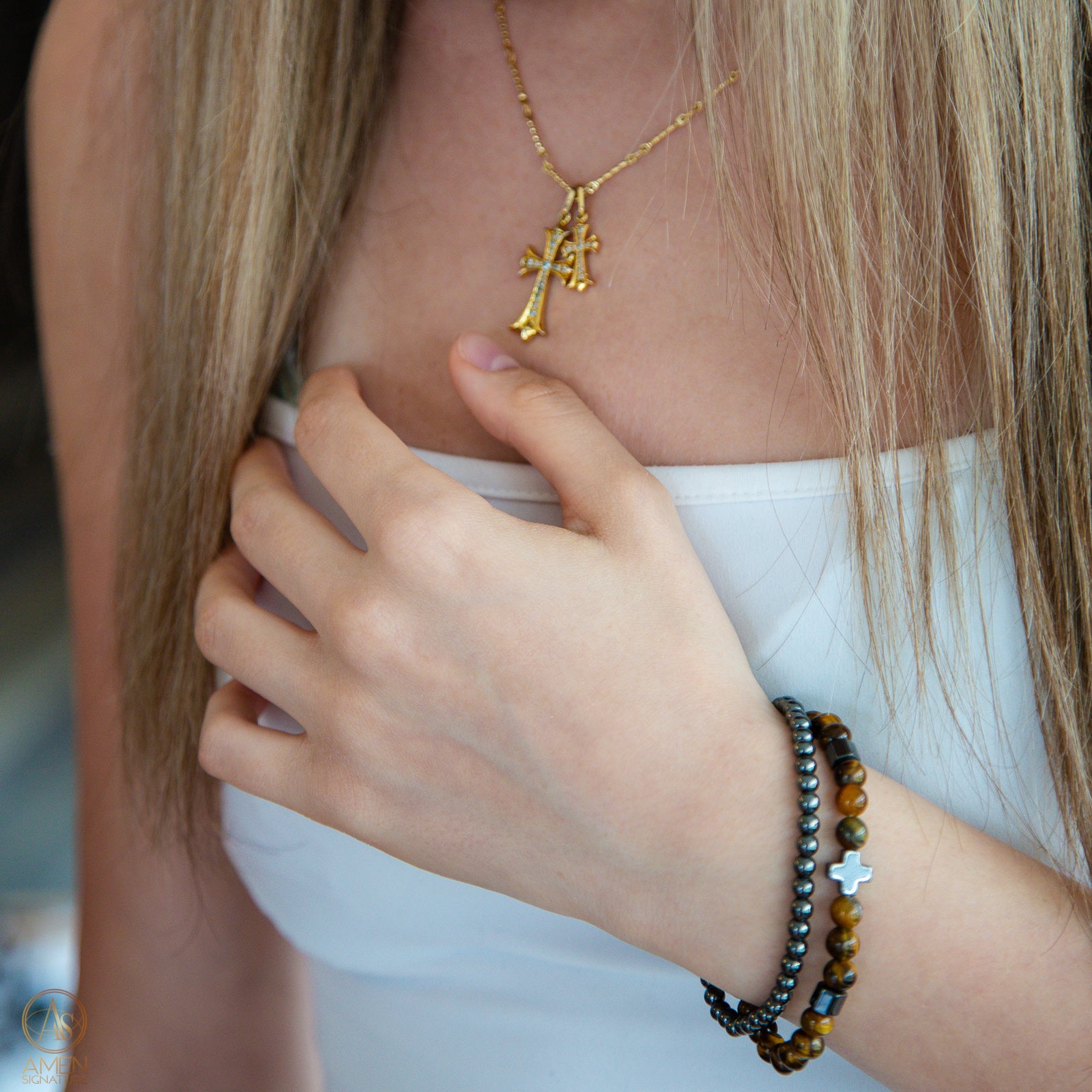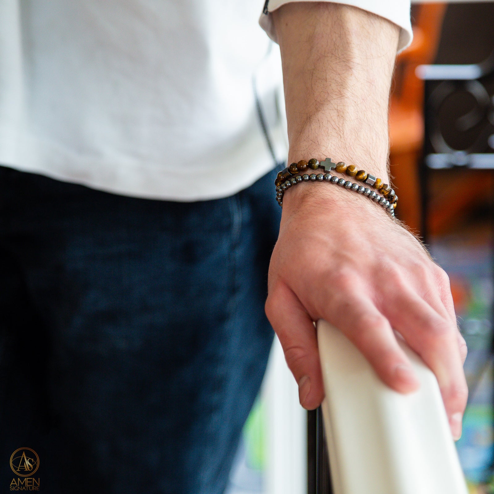 Ce bracelet chrétien évoque la stabilité, la force, la clarté spirituelle et le courage face à l’adversité. Une croix en hématite vient rappeler l’ancrage spirituel de celui ou celle qui le porte. Chaque perle capte la lumière avec une profondeur unique, évoquant la vigilance et la protection.