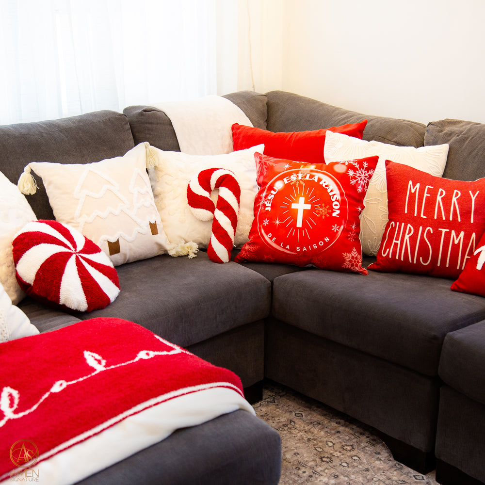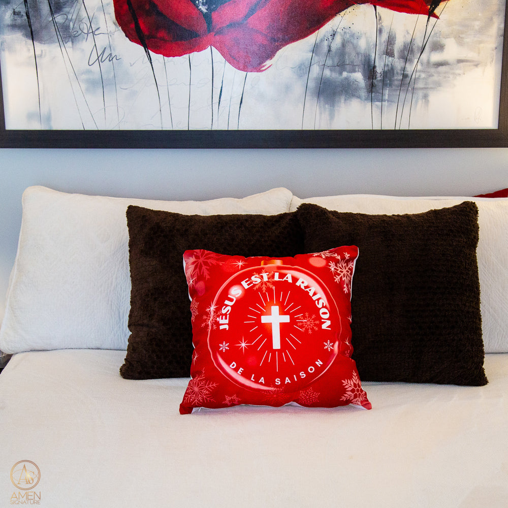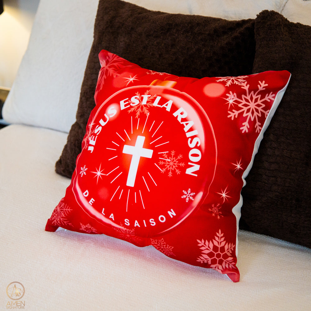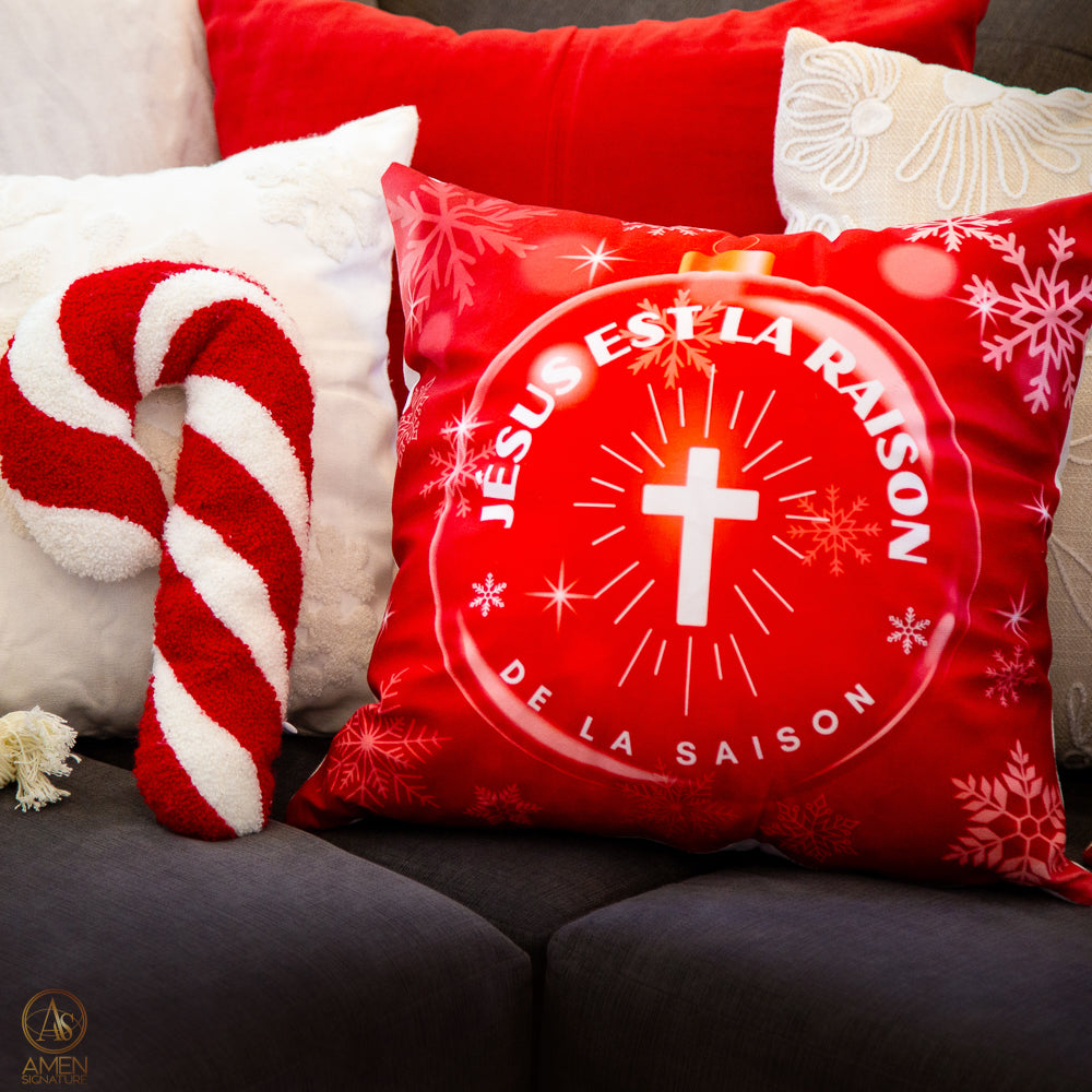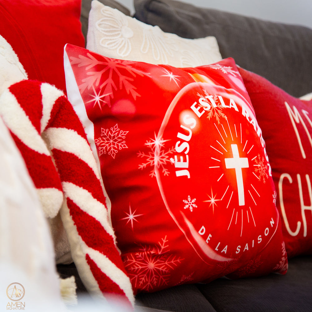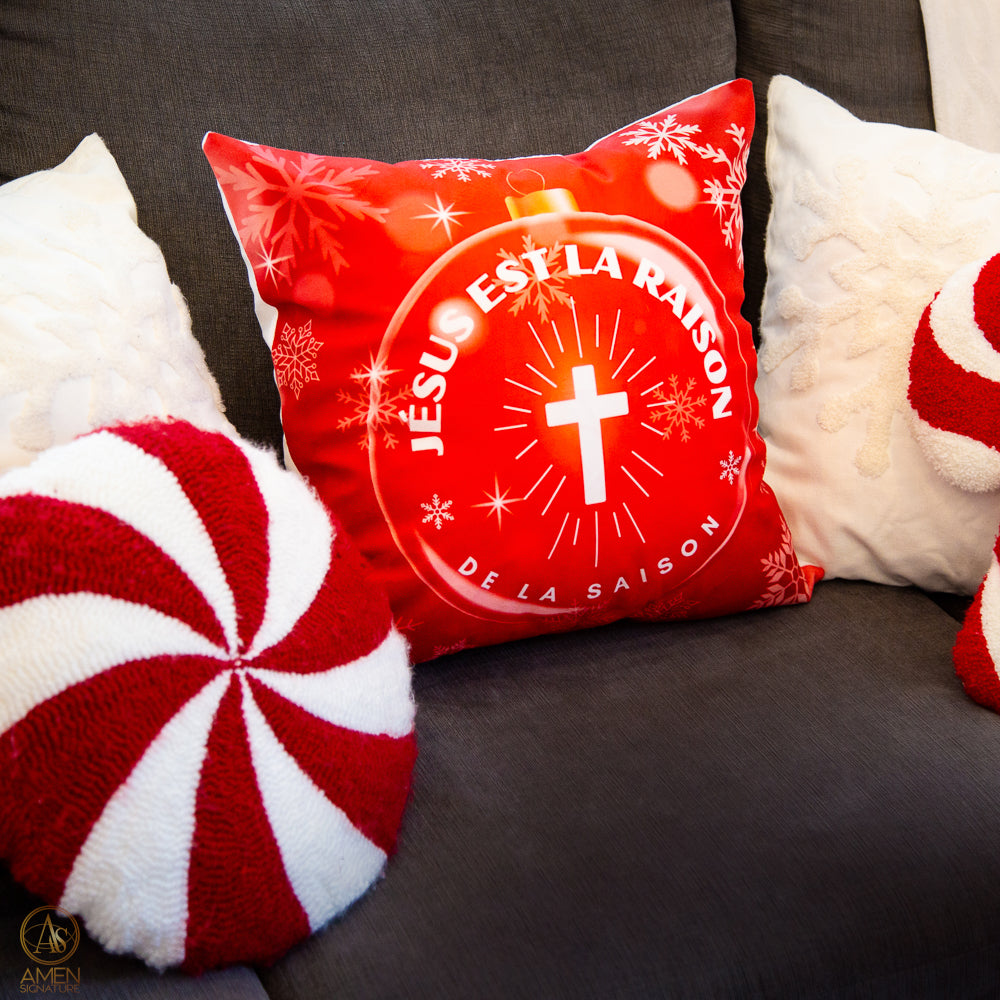 Apportez une touche inspirante à votre décor des Fêtes avec cette housse de coussin Jésus est la raison de la saison.