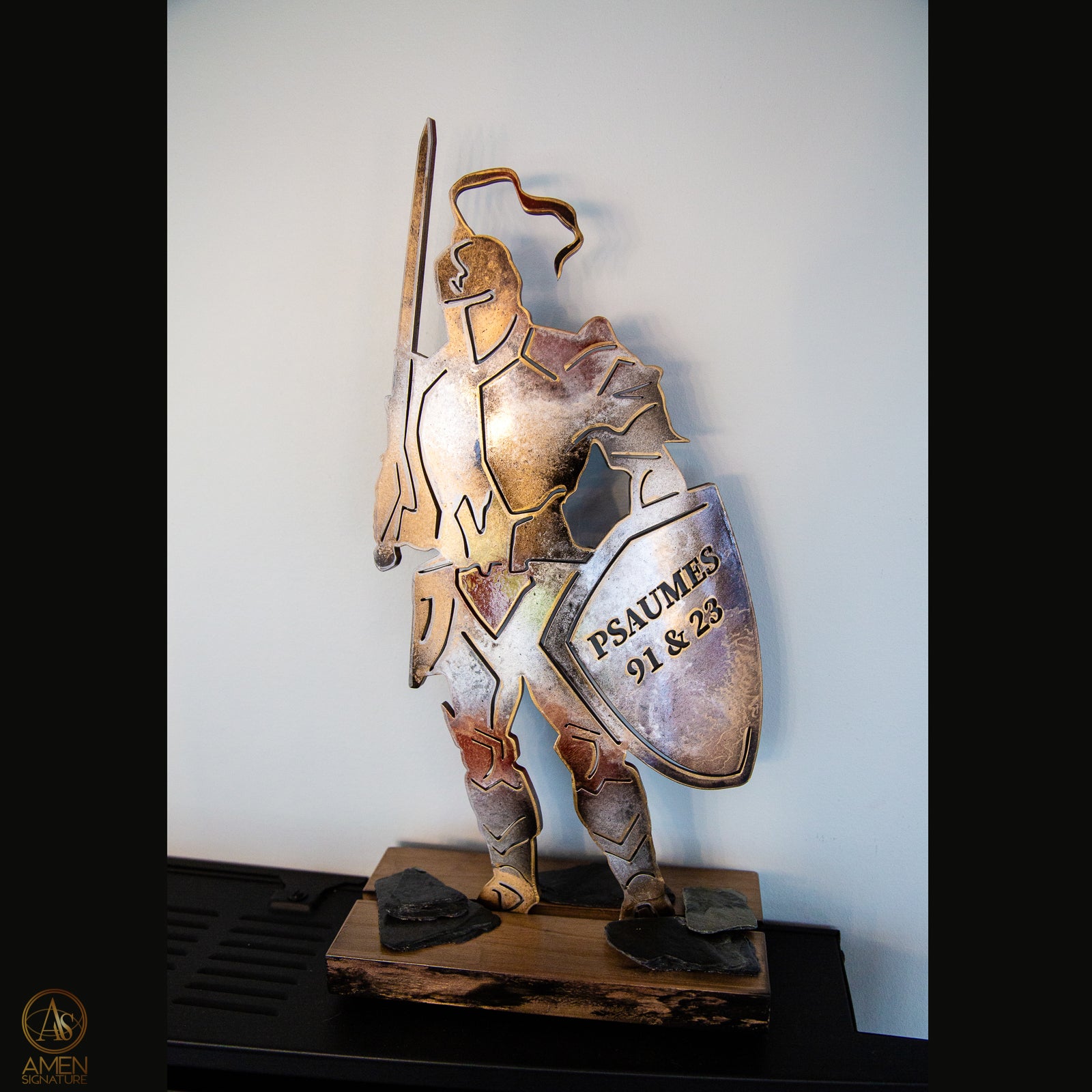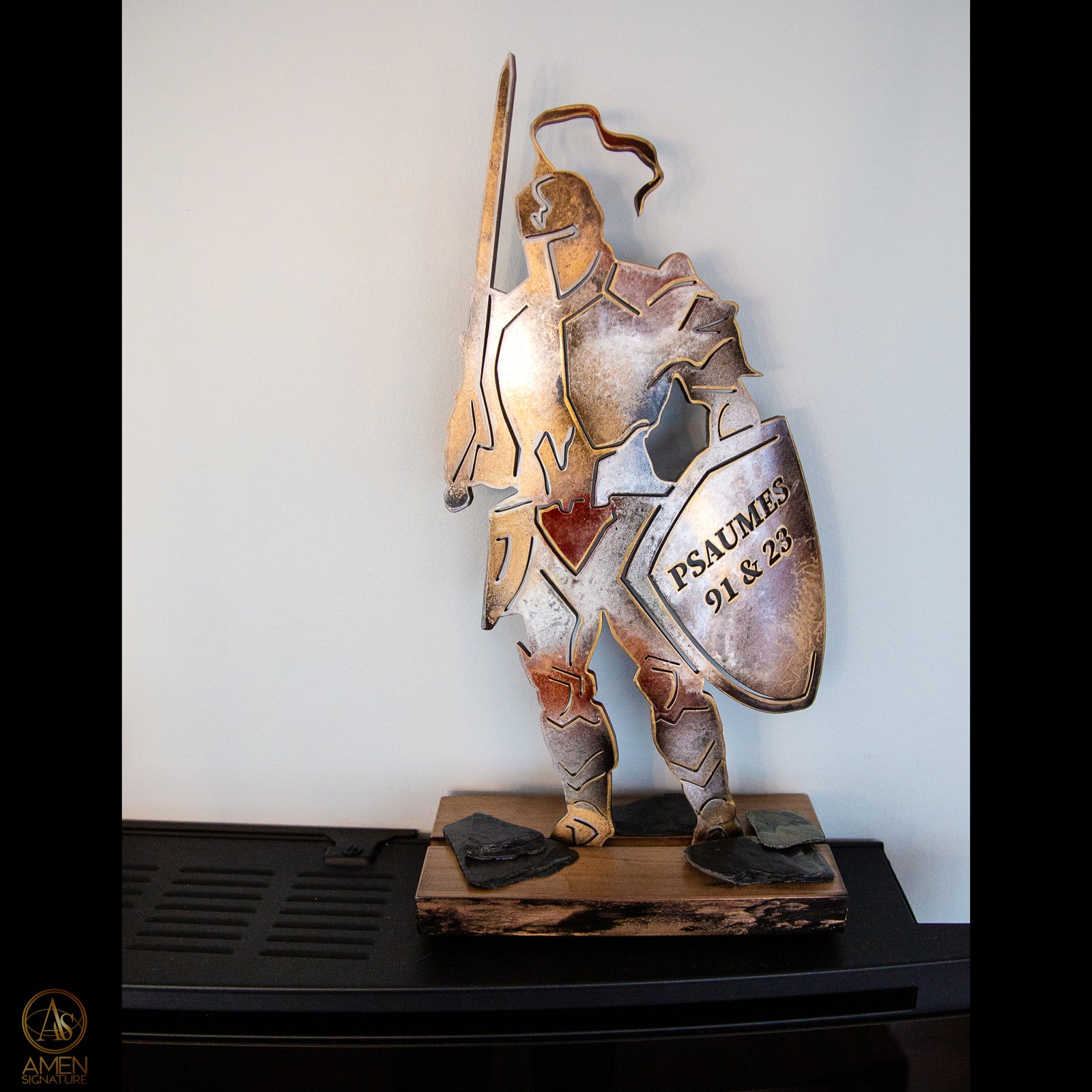 Symbole de courage et de foi, Le Guerrier de la Foi est une œuvre artisanale unique, née du talent d’un artisan de l’acier et peintre local chrétien. Une œuvre d’art exclusive à Amen Signature.