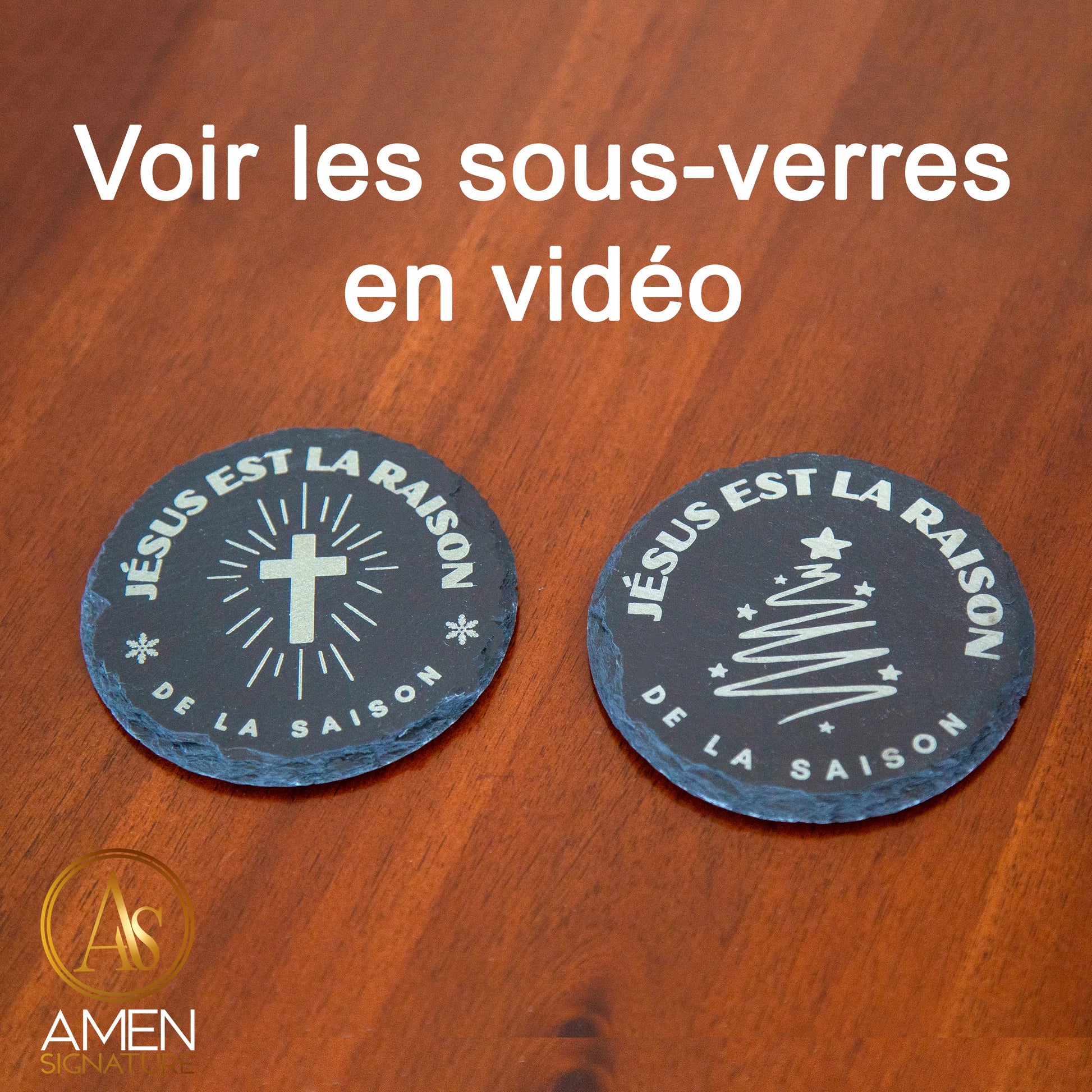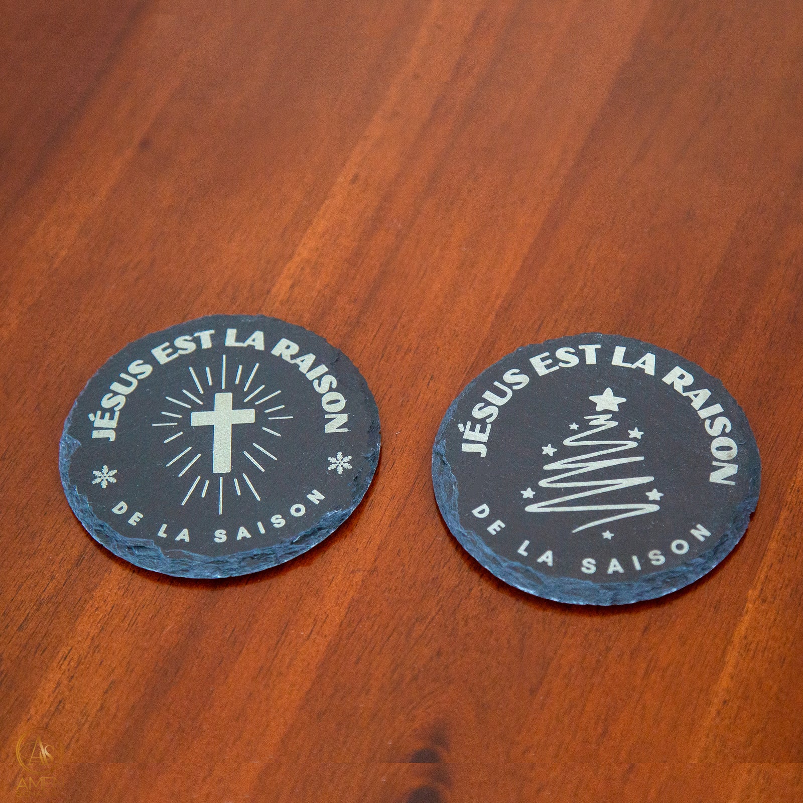 Découvrez cet ensemble de 4 sous-verres en ardoise naturelle gravés du message Jésus est la raison de la saison avec une croix lumineuse au centre. Leur design sobre, intemporel et profondément significatif fait de chaque sous-verre un petit témoignage discret mais puissant dans votre quotidien.
